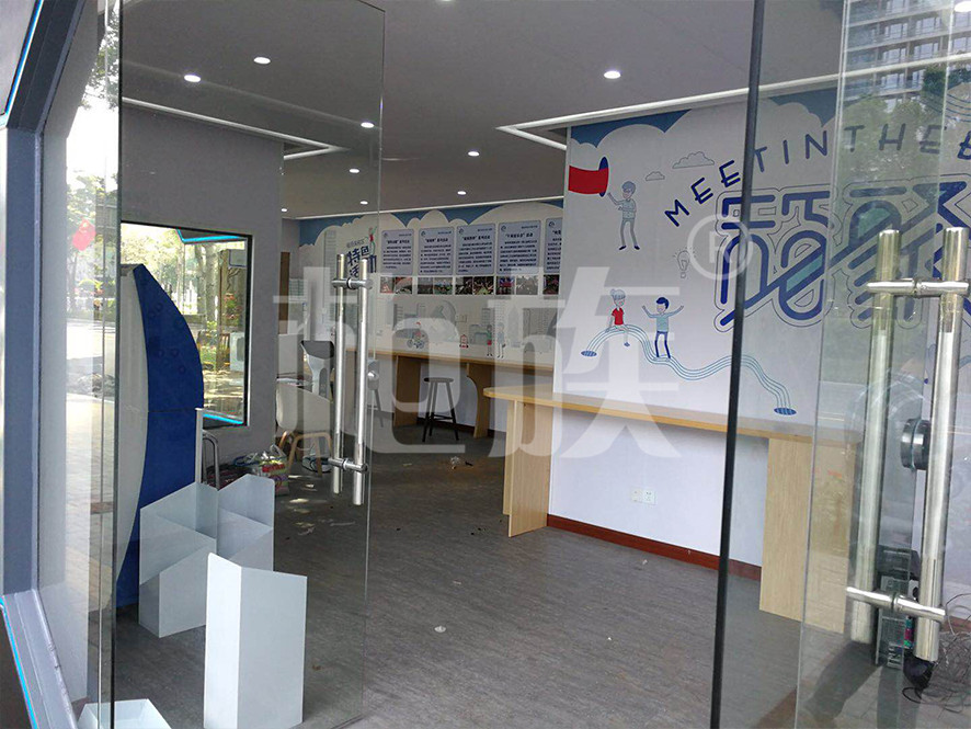 驛站使用兩個(gè)集裝箱錯(cuò)位串聯(lián)而成,正面墻體使用大面積玻璃門(mén)窗,線條流暢、棱角分明,造型時(shí)尚,通透亮堂,很好地突出了驛站的標(biāo)志性與開(kāi)放性特點(diǎn)。