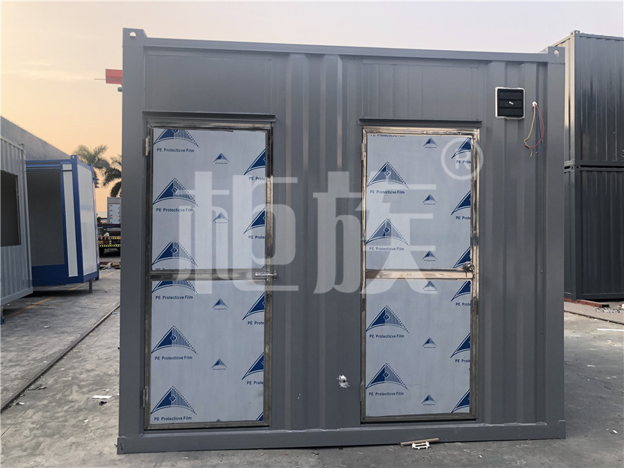 箱體用材:鍍鋅方管框架、A級大波紋夾芯墻板、不銹鋼門、鋁花紋地板。