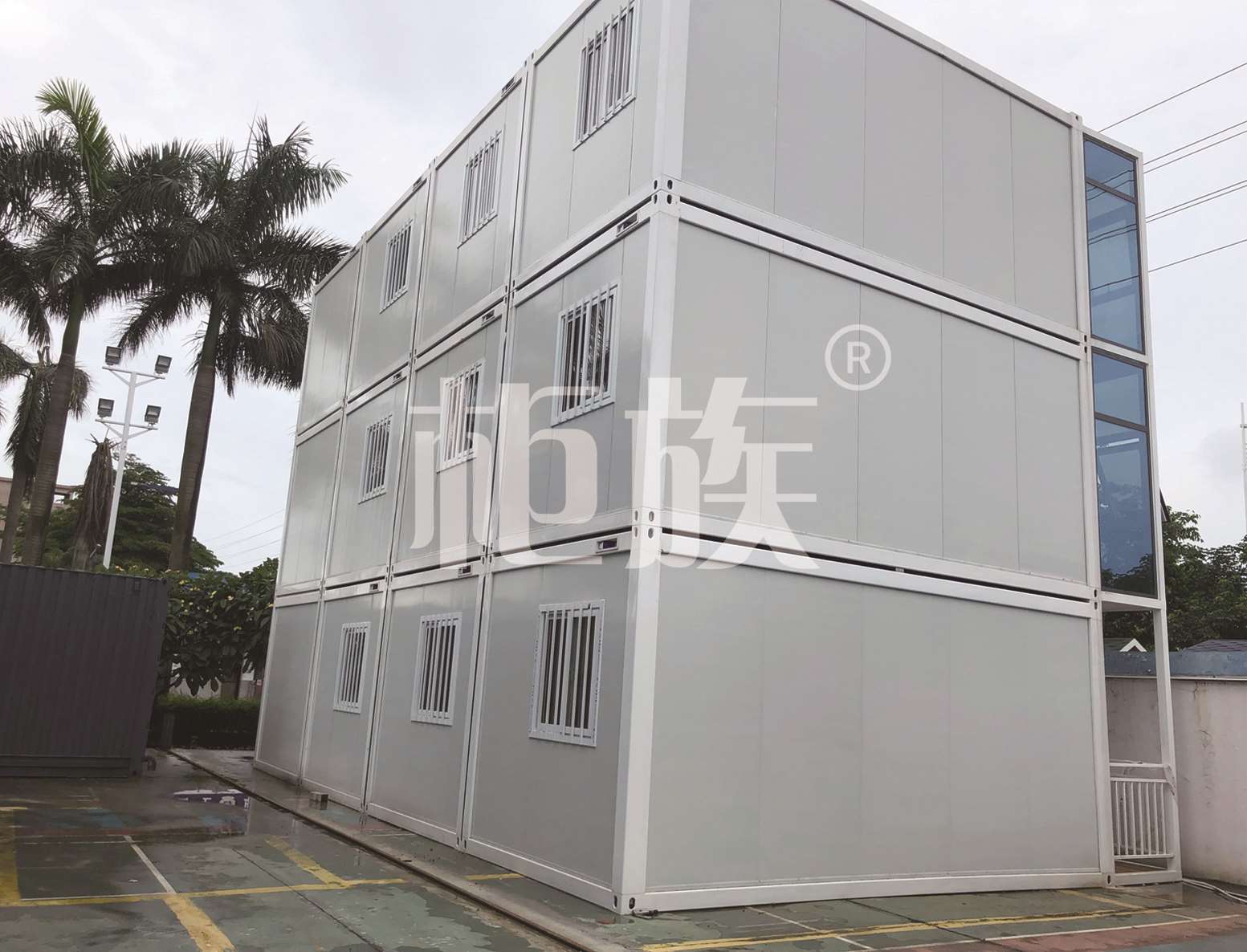 該打包箱辦公室上下三層,在設(shè)計(jì)上注重功能的實(shí)用性和選材用材的環(huán)保性??傮w約可容納50人的辦公和會議需求。
