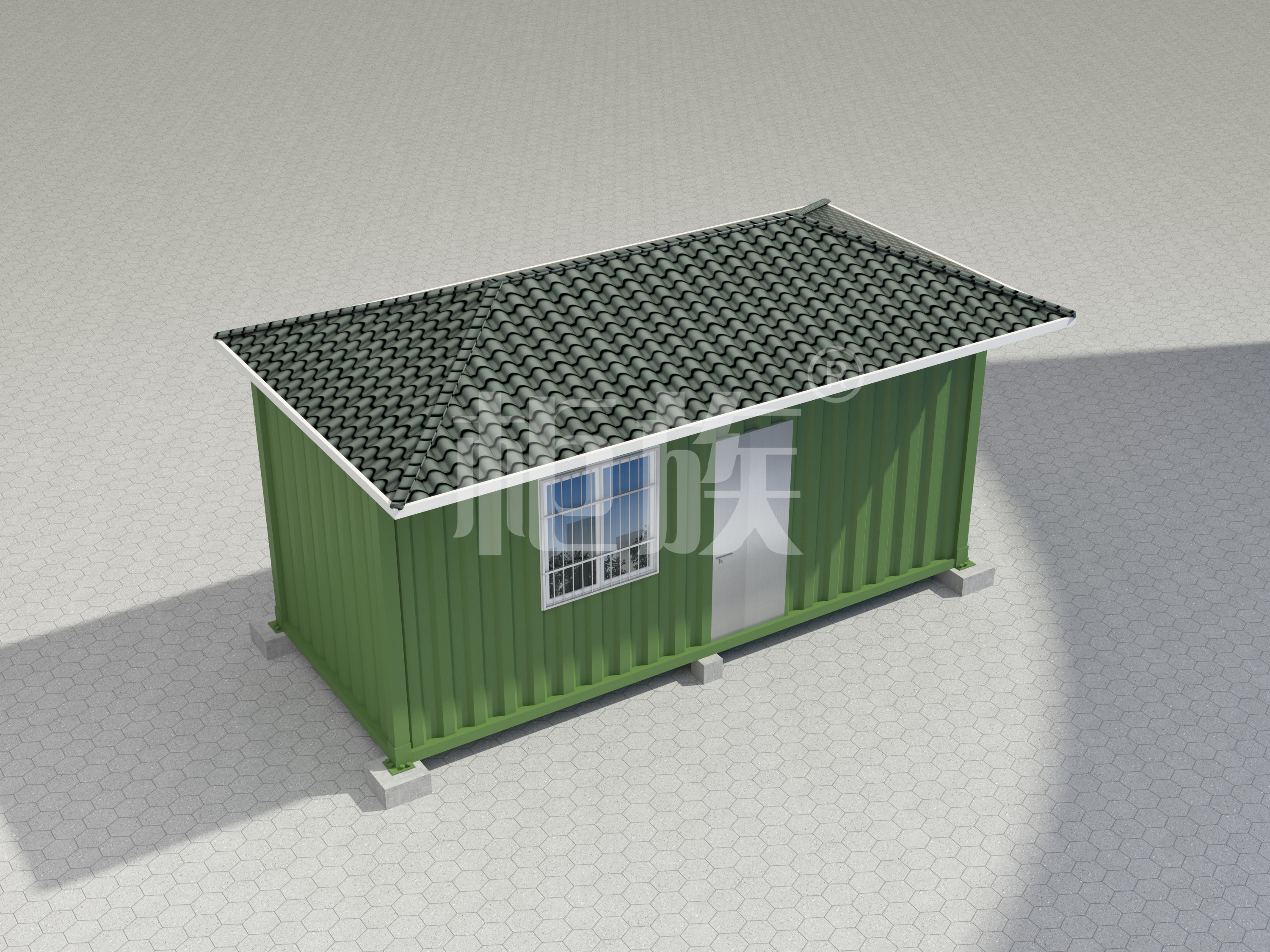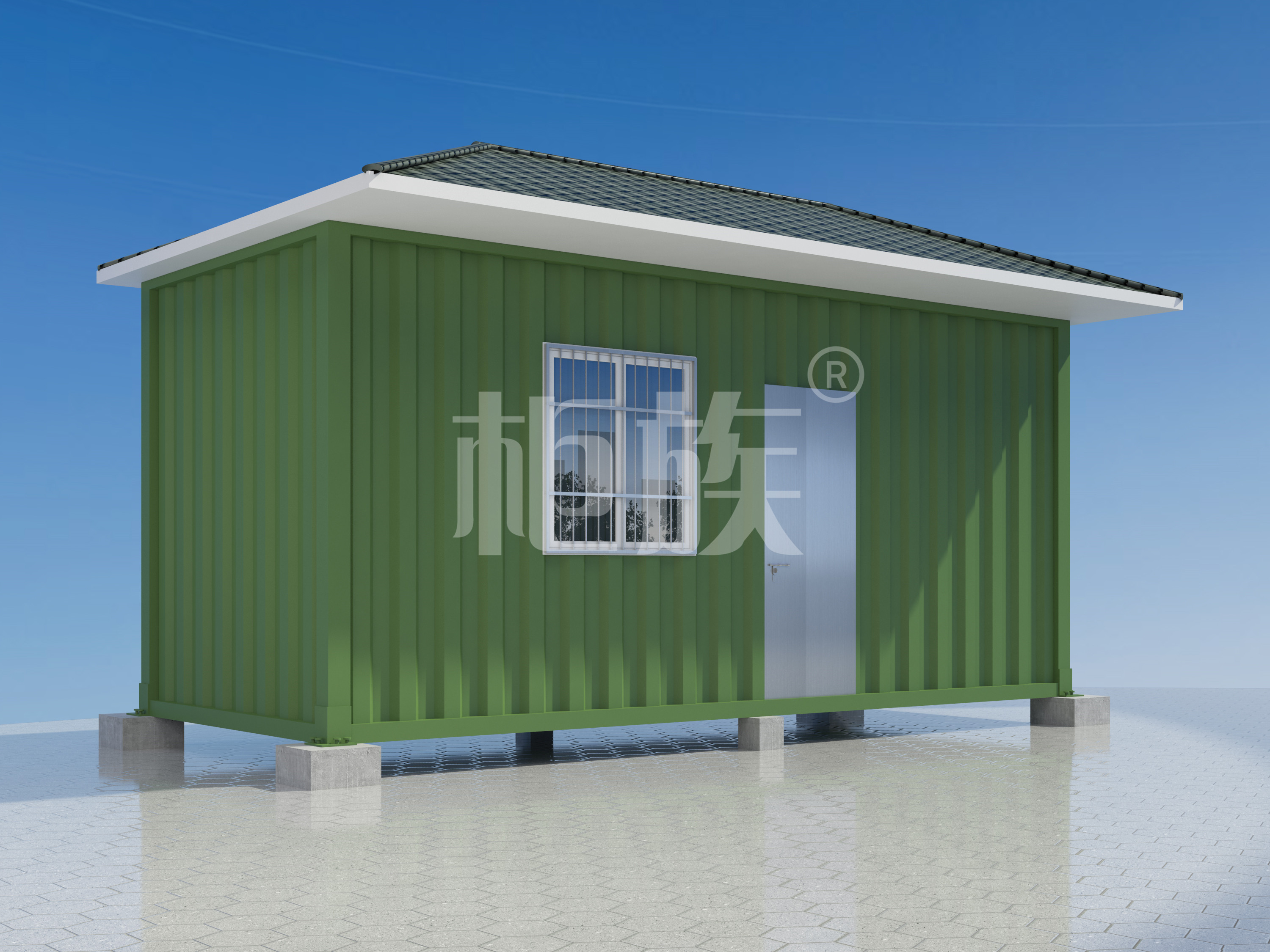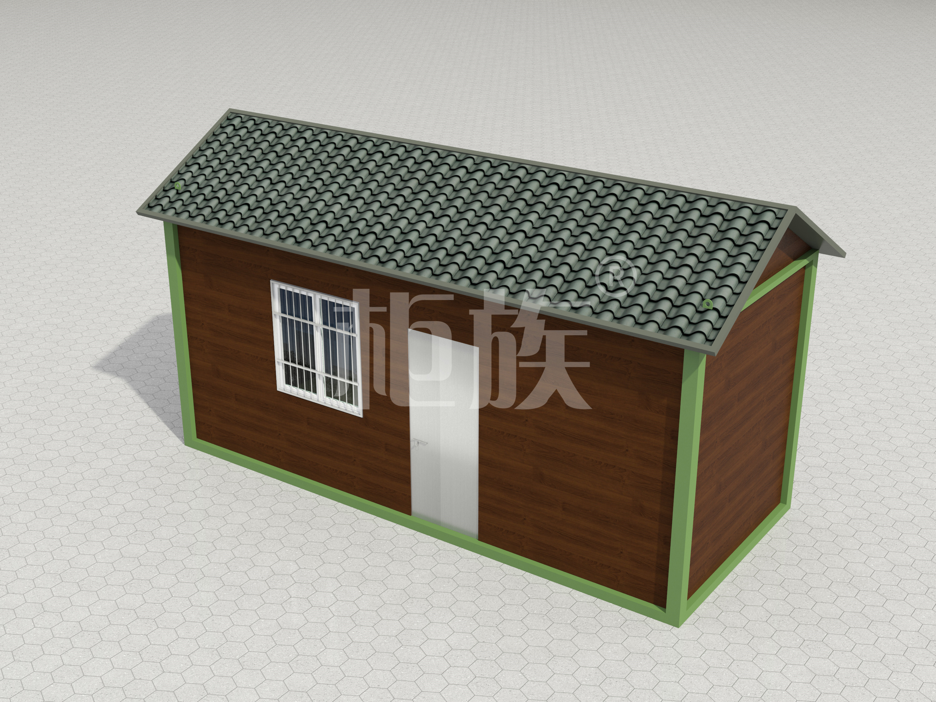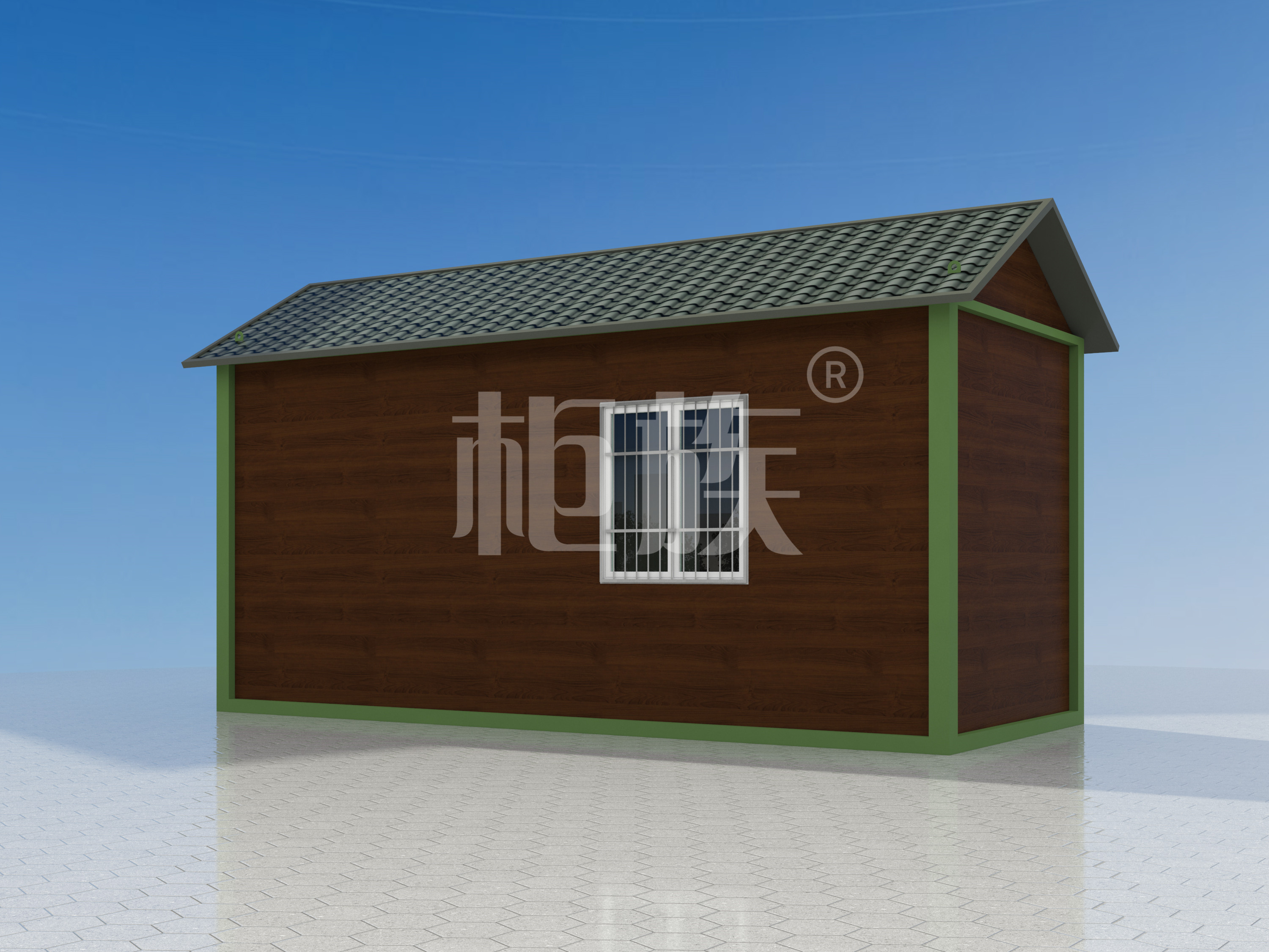 鍍鋅方管框架、瀝青瓦斜頂、墻面簡約線條裝飾,造型美觀,防風(fēng)防潮性能好,可供魚塘養(yǎng)殖人員使用。